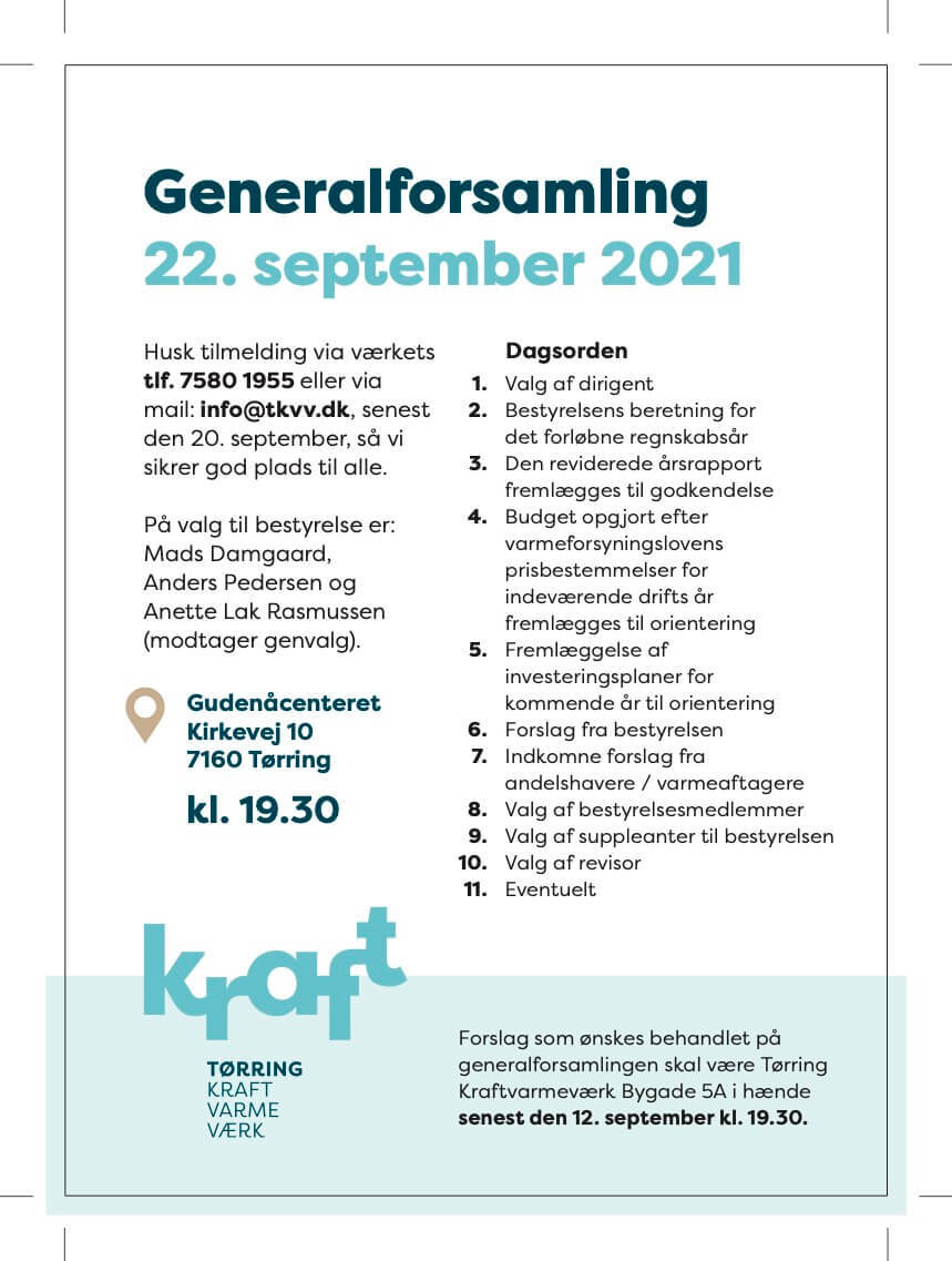 Forslag som ønskes behandlet på generalforsamlingen skal være Tørring Kraftvarmeværk Bygade 5A i hænde senest den 12. september kl. 19.30.